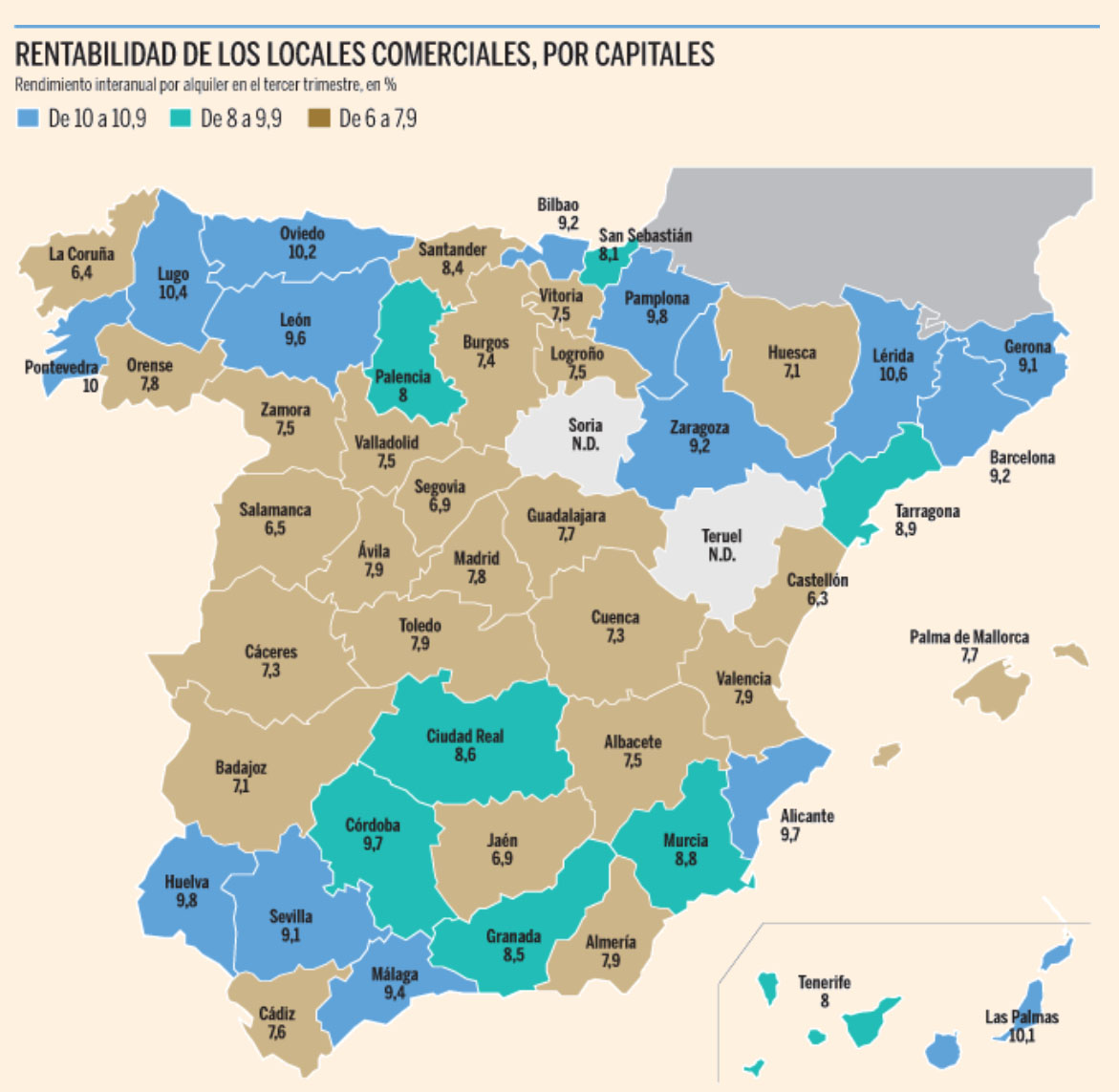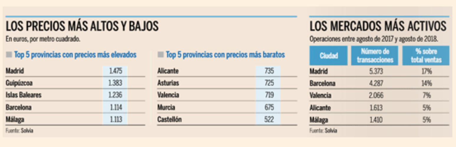 Solvia calcula que de cada 100 locales ofertados, se venden alrededor de 40. Entre las diez principales capitales españolas, Las Palmas, Málaga, Baleares, Alicante, Santa Cruz de Tenerife y Madrid son las que tienen el índice de rotación más alto. En un escalón inferior, el medio, se sitúan Sevilla, Valencia, Barcelona y Zaragoza.