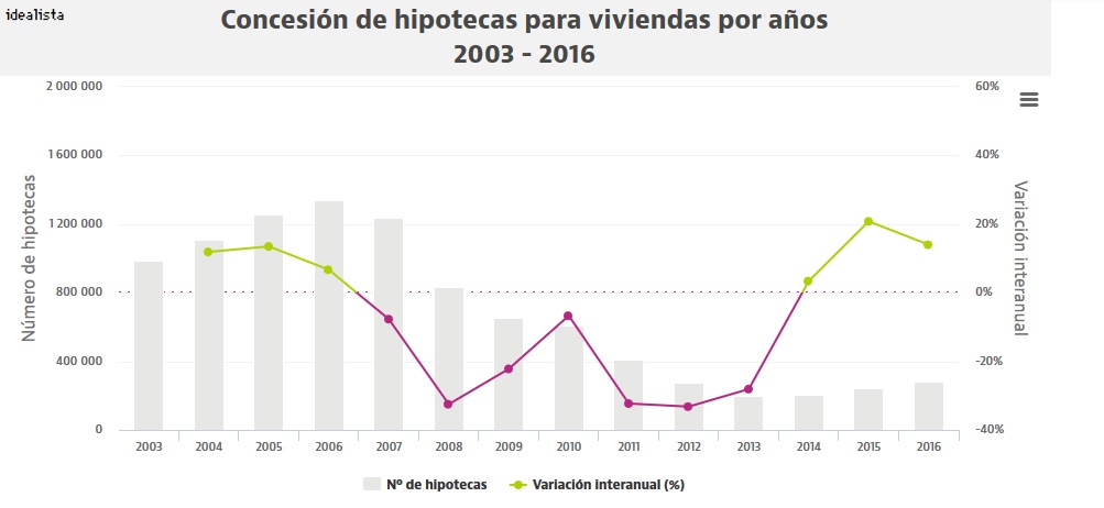 Pese a que el dato de concesión de hipotecas para vivienda tuvo una caída del 18,4% intermensual en diciembre, con 20.747 contratos (el tercer peor dato del año), tuvo un incremento interanual en dicembre del 6,9%. Los préstamos hipotecarios para vivienda cerraron por tercer año consecutivo al alza desde los mínimos registrados en 2013. Con 281.328 contratos firmados, en 2016 las hipotecas crecieron un 14%, aunque muy lejos de las más de 1,3 millones de hipotecas concedidas diez años antes.