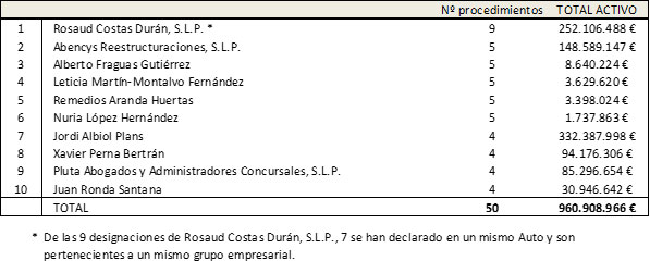 El “top ten” de administradores concursales más designados representa el 15,45% del total de procedimientos, siendo SLPs los nuevos primeros administradores con mayor número de casos.