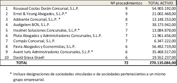 Las cinco empresas con mayor activo de Barcelona declaradas en concurso durante el 2016 tienen designadas como administradores concursales a Sociedades Limitadas Profesionales y sólo las diez primeras representan el 31% del total activo concursal.
